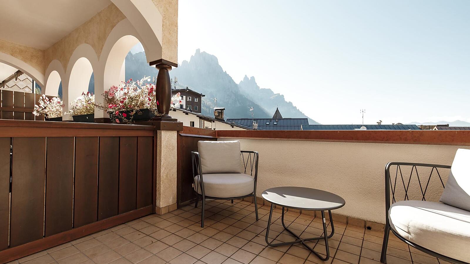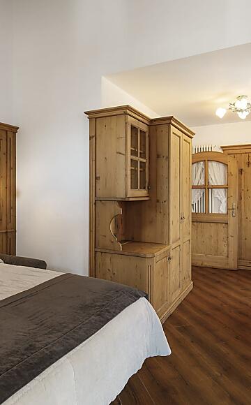 Zimmerausstattung: Balkon mit Blick auf die Dolomiten, kostenloses WLAN, Minibar, Direktwahltelefon, LCD-TV (Pay-per-View-Kanäle), Safe, Parkett- oder Holzboden, Kleiderschrank, Gemeinschaftsbad mit Dusche und Haartrockner, kostenlose Toilettenartikel