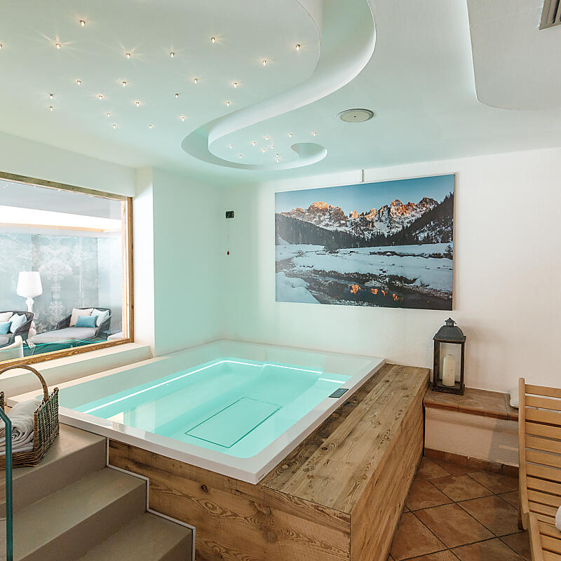 The temperature of our Tyrolean sauna is high (80°/100° C), and humidity is low (35%). The body heats up quickly and the heat induces perspiration, pores dilate, and the body rids itself of all impurities. A sauna relieves fatigue and is said to boost immunity.